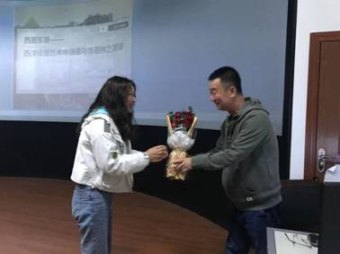李院长通过两个小时的讲座,给在座的师生进行了一次西方绘画的巡礼,使大家很受益。讲座结束后,艺术学院学生代表、2018级美术学本科生盛莉同学上台为李福岩教授献花致谢。