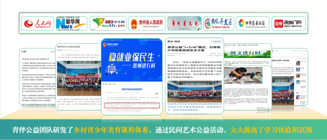 青伴公益专注于乡村青少年的艺术启蒙与成长,致力于通过艺术为他们铺设一条成才之路。团队开创“1+3+N”模式,实现1支公益服务队加3个支持方(高等院校、地方政府、民间机构),实现了讲、育、传三个方面的多种呈现形式,打造乡土美育课程体系,建造六位一体的推广模式,以点带面,实现模式可复制可推广。