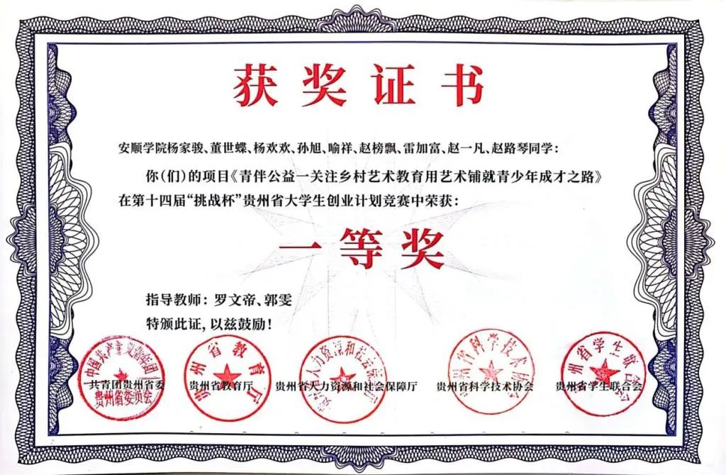 近期,由共青团贵州省委、贵州省教育厅、贵州省人力资源和社会保障厅、贵州省科学技术协会、贵州省学生联合会共同主办的第十四届“挑战杯”贵州省大学生创业计划竞赛,在贵阳人文科技学院(大学城校区)举行,安顺学院《青伴公益—关注乡村艺术教育用艺术铺就青少年成才之路》团队经过不懈努力在竞赛中喜获省级一等奖1项,实现了我校新突破。